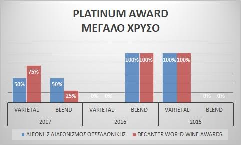 Στην κατηγορία του Μεγάλου Χρυσού/Platinum Award, φαίνεται ότι τα αποτελέσματα και οι προτιμήσεις των κριτών συμπίπτουν πλήρως όσον αφορά τις χρονιές του 2015 και του 2016, με τη διαφορά ότι στην πρώτη περίπτωση προτίμησαν μονοποικιλιακούς οίνους, ενώ στην δεύτερη πολυποικιλιακούς. Το 2017, φαίνεται ότι τα κρασιά που βραβεύτηκαν με το μεγάλο βραβείο και στους δύο διαγωνισμούς, προέρχονται και από τις δύο κατηγορίες με τους κριτές του Decanter να δείχνουν μια προτίμηση στα μονοποικιλιακά.