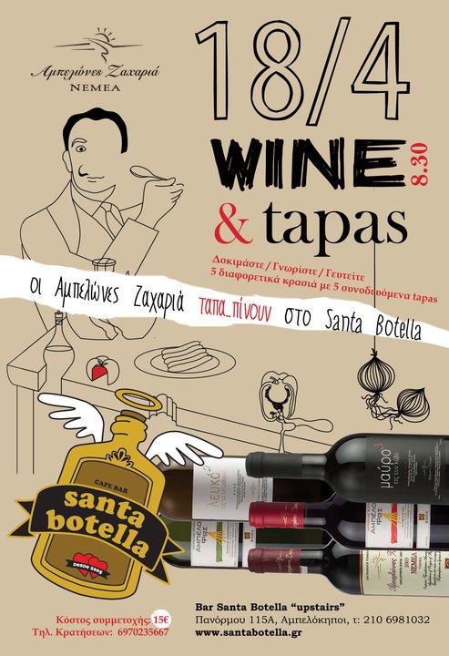 Δευτέρα 18 Απριλίου στις 20:30, μια πρωτότυπη βραδιά γευσιγνωσίας! 5 κρασιά των Αμπελώνων Ζαχαριά παντρεύονται παιχνιδιάρικα και γευστικά με 5 επιλεγμένα tapas από το Santa Botella.