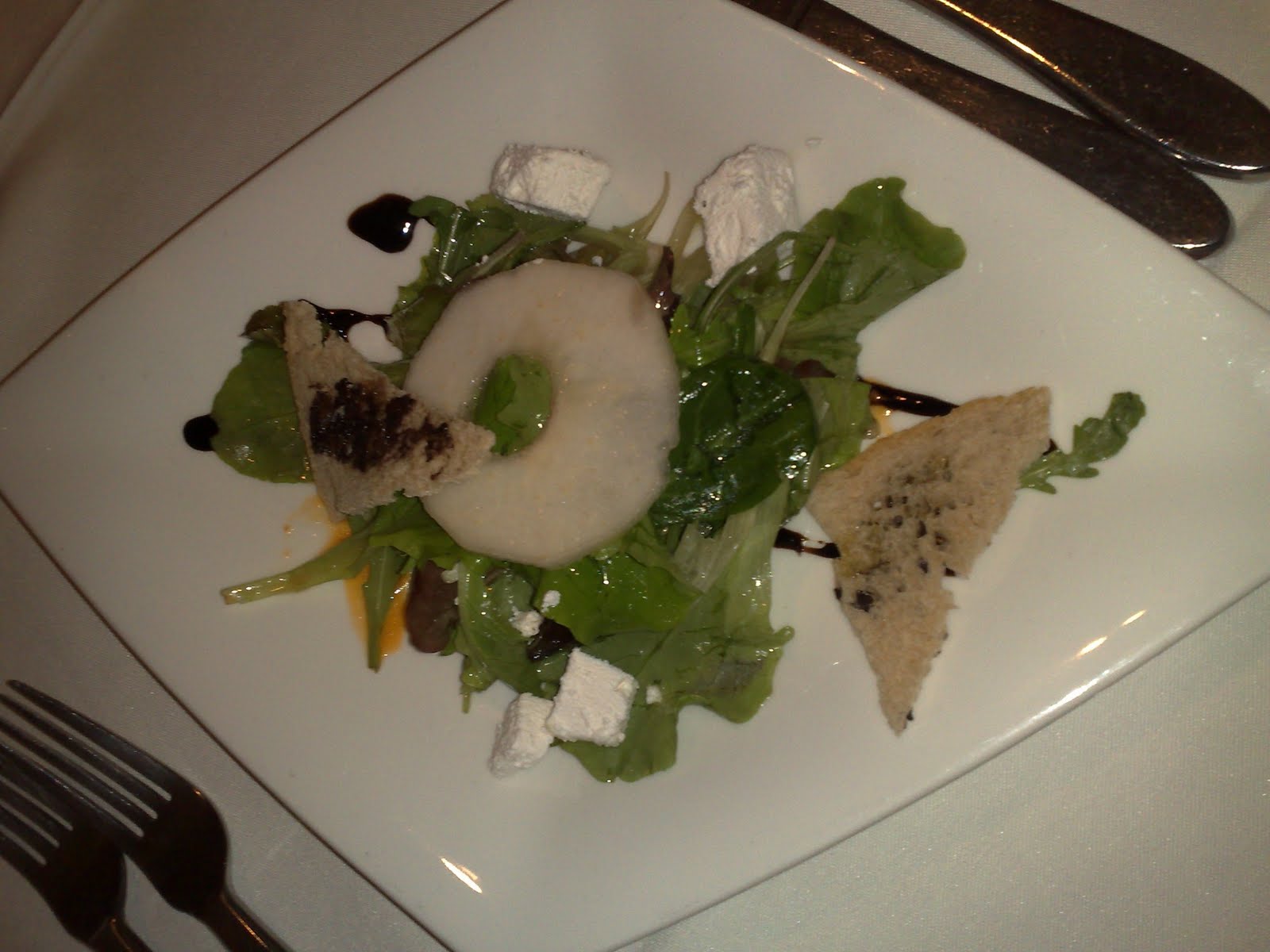 Mesclun σαλάτα ανάμεικτων λαχανικών(σπανάκι,Λόλα ρόσα, φύλα μουστάρδας, πικραλίδα, mizuna κ.α) με αχλάδι, ανθότυρο και βινεγκρέτ χαμομήλι