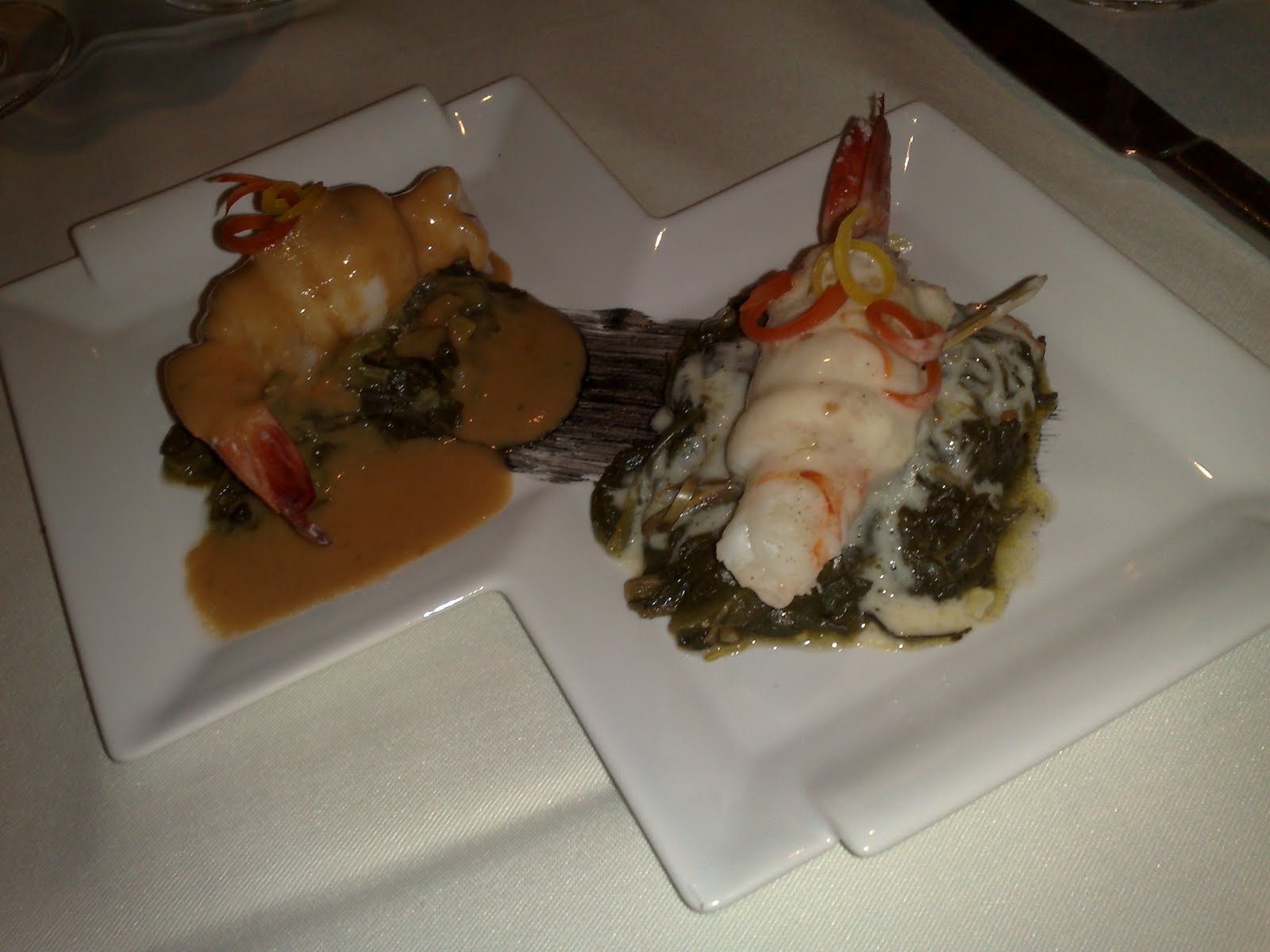 Ποπιέτες με φιλέτο γλώσσας με γαρίδες, σάλτσα σαφράν, φινόκιο, φρικασέ σπανάκι, μπισκ γαρίδας και βινεγκρέ από μελάνι σουπιάς.