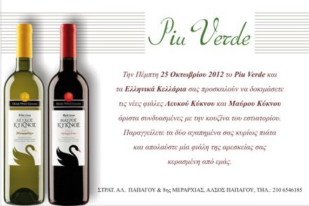 Την Πέμπτη 25 Οκτωβρίου 2012 η Ελληνικά Κελλάρια Οίνων Α.Ε. και το εστιατόριο Piu Verde (Στρατηγού Παπάγου & 8ης Μεραρχίας, τηλ.: 210-6546185) σας καλούν να δοκιμάσετε μια απολαυστική προσφορά.