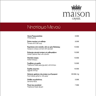 Το Maison Crystal προσφέρει ένα νηστίσιμο μενού(βλ.παρακάτω) που μπορείτε να συνδυάσετε με ένα από τα 42 κρασιά της λίστας Οινοποιείο +4. Η λίστα κρασιών περιλαμβάνει κρασιά από τον Ελληνικό Αμπελώνα σε ελκυστικές τιμές που ξεκινούν από 13,5€ η φιάλη(Μοσχοφίλερο Σκούρας) για τα λευκά και 14€ για τα ερυθρά.
