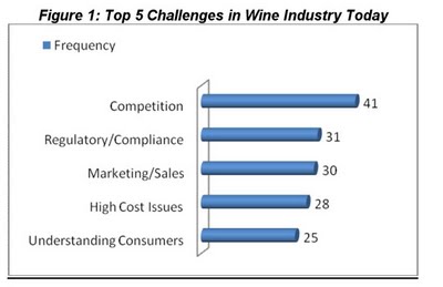 Η δεύτερη πιο συχνά αναφερόμενη πρόκληση ήταν τα ρυθμιστικά ζητήματα και τα ζητήματα συμμόρφωσης. «Πάρα πολλοί κυβερνητικοί κανονισμοί & φόροι!» έγραψε ένας ερωτηθείς. Η διαχείριση όλων των ζητημάτων μάρκετινγκ και πωλήσεων για τη λειτουργία μιας επιχείρησης κρασιού ταξινομήθηκε ως η τρίτη μεγαλύτερη πρόκληση. «Η εύρεση δημιουργικών τρόπων για να πουλήσεις ανάμεσα στα δίκτυα διανομής, στα καταστήματα λιανικής … και απευθείας στον καταναλωτή» είναι ένα παράδειγμα των σχολίων σε αυτήν την κατηγορία. Ο έλεγχος των υψηλών δαπανών για να επιτύχει κανείς επαρκή περιθώρια αποδοτικότητας αναφέρθηκε συχνά. Όπως ανέφερε ένας επικεφαλής οινοποιείου «το να ελέγχεις τις δαπάνες βελτιώνοντας παράλληλα και την ποιότητα,» είναι πολύ απαιτητικό. Η πέμπτη σημαντικότερη πρόκληση είναι το να καταλαβαίνεις τους καταναλωτές κρασιού και να συμβαδίζεις με όλες τις αλλαγές στις τάσεις του κρασιού. «Η προσαρμοστικότητα στις νέες τάσεις στην κατανάλωση κρασιού,» ήταν μια κοινή αίσθηση σε αυτήν την κατηγορία.