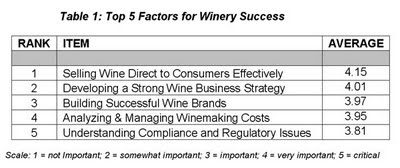 Τώρα μια νέα μελέτη, που πραγματοποιείται από το Wine Business Institute στο Sonoma State University, δείχνει ποιοι είναι οι πέντε κορυφαίοι παράγοντες επιτυχίας και προσδιορίζει επίσης τις βασικές προκλήσεις. Η έρευνα, που πραγματοποιήθηκε κατά τη διάρκεια της άνοιξης του 2011, περιέλαβε τις απαντήσεις από 149 επιχειρήσεις κρασιού, από τις οποίες το 90% ήταν στην Καλιφόρνια. Από άποψη μεγέθους, 59% παρήγαγαν κάτω από 10.000 κούτες, 22% κυμάνθηκαν από 11 έως 100.000 κούτες, και 19% παρήγαγαν πάνω από 100.000 κούτες.