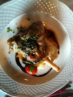 Κότσι αρμόδιο αρωματισμένο με λεμονόφυλλα, σερβίρεται με πουρέ μελιτζάνας & πράσινη σαλάτα με μυρωδικά.