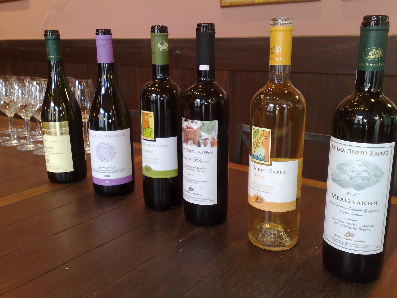 Μία σύντομη ξενάγηση στους χώρους οινοποίησης και αποθήκευσης και μεταφερθήκαμε στο κτήριο γευσιγνωσιών όπου μας περίμενε μία, η μάλλον δυο, ευχάριστες εκπλήξεις. Πέρα από τις ετικέτες λευκών κρασιών του κτήματος σοδειάς 2010, είχαμε να κάνουμε κάθετη 10 σοδειών στο Chateau Porto Carras και 10 σοδειών Syrah!