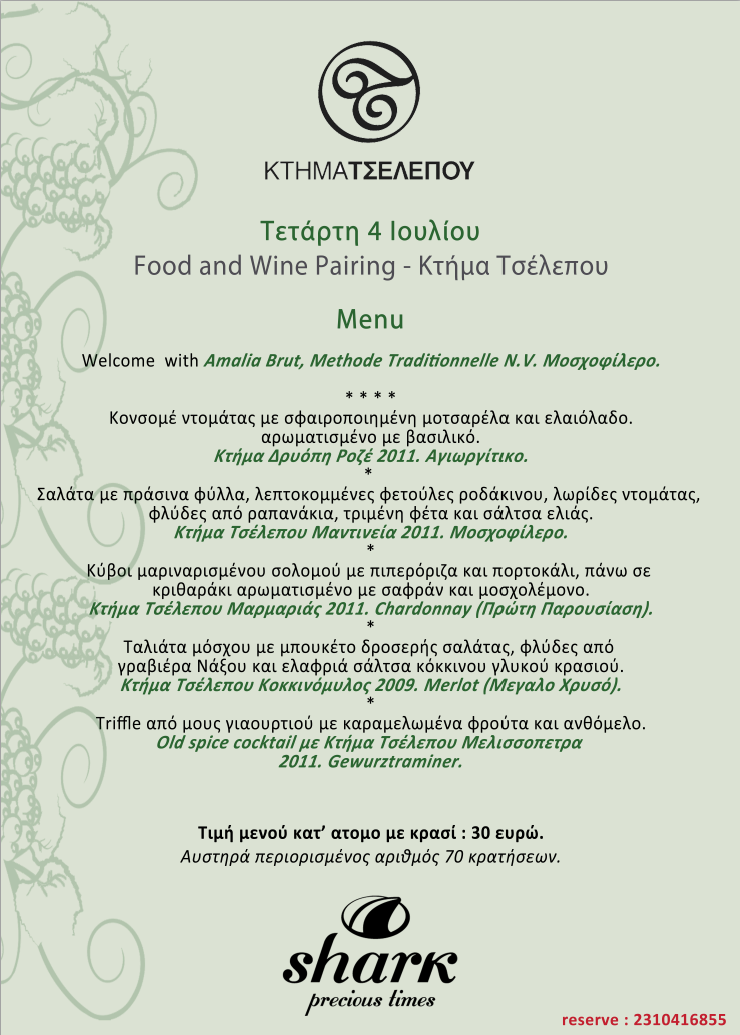 Μερικές από τις πιο αγαπημένες ετικέτες του Κτήματος Τσέλεπου,θα συνδυαστούν με το ειδικά για την συγκεκριμένη βραδιά μενού, που έχει επιμεληθεί ο βραβευμένος chef του Shark, Βασίλης Τσιφλικιώτης.