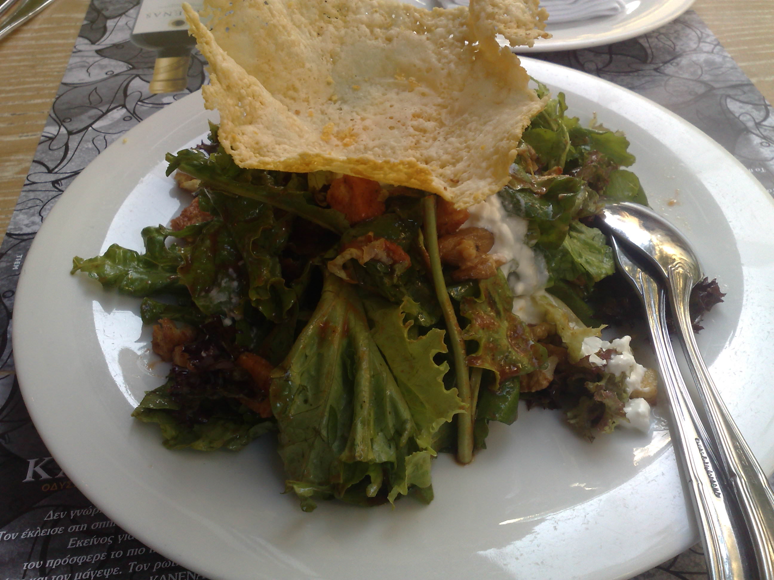 Πράσινη σαλάτα σε φωλιά παρμεζάνας, μαριναρισμένες γαρίδες, σάλτσα φέτας και ντρέσιγκ ντομάτας