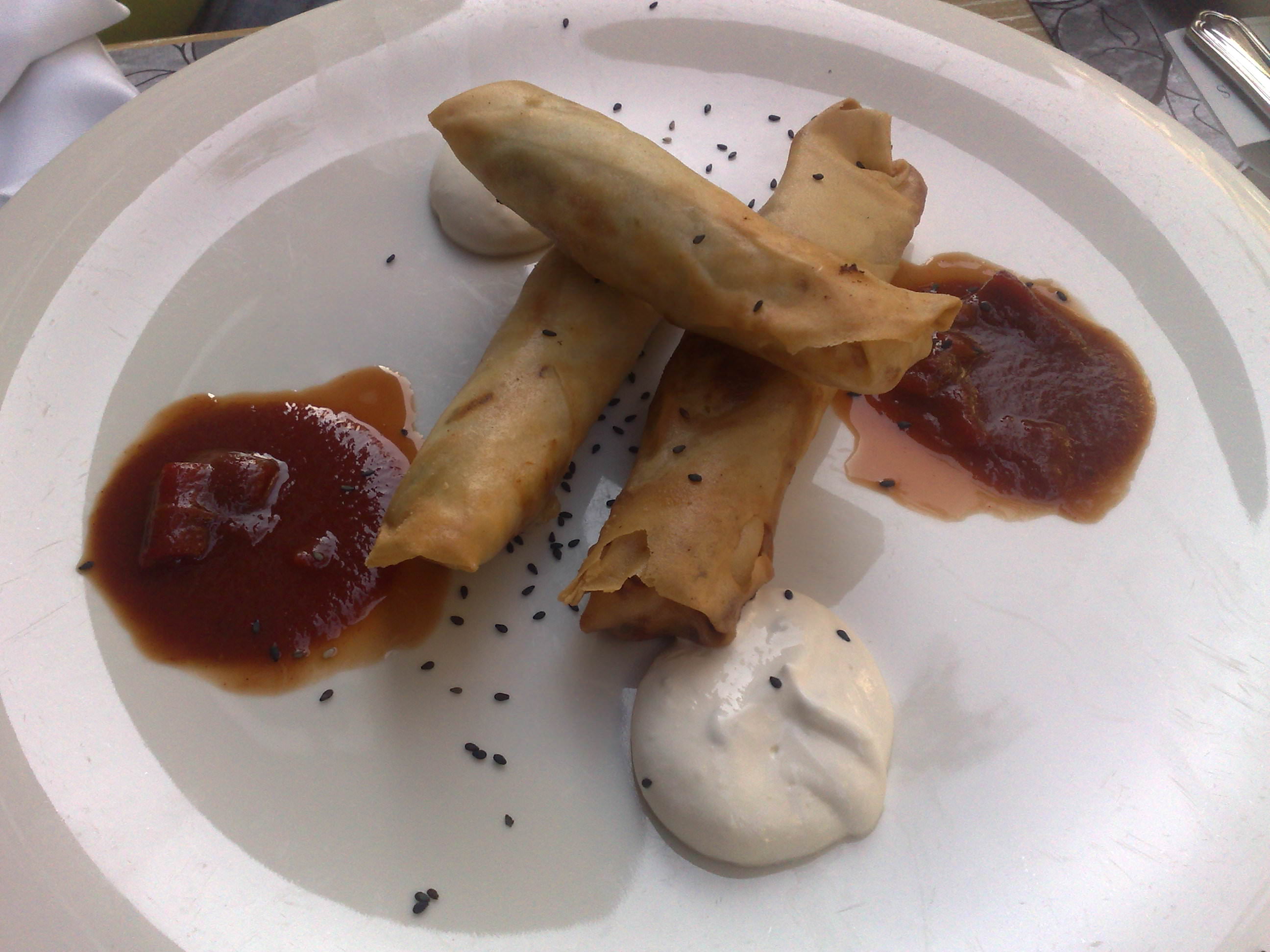 Spring Roll γαρίδας με σως πικάντικης πιπεριάς και κρέμα φιλαδέλφεια