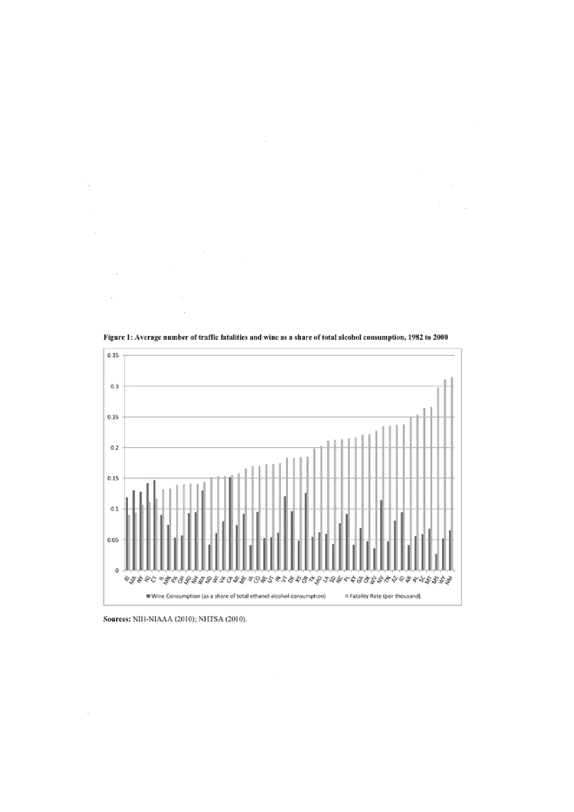 Τα υπόλοιπα αλκοολούχα ποτά συνδέονται περισσότερο με τα θανατηφόρα τροχαία ατυχήματα από ότι το κρασί, αλλά λιγότερο από ότι η μπύρα. Το παρακάτω διάγραμμα δείχνει ότι τα κράτη με μεγάλη κατανάλωση κρασιού (σκούρα γκρι μπάρα) έχουν μικρά ποσοστά θανατηφόρων τροχαίων ατυχημάτων (ανοικτή γκρι μπάρα) έναντι των κρατών με μικρή κατανάλωση κρασιού: Ενώ η μελέτη δεν αρνείται το γεγονός ότι τα κράτη με τα πιο υψηλά επίπεδα συνολικής κατανάλωσης αλκοόλ έχουν περισσότερα θανατηφόρα τροχαία ατυχήματα, αμφισβητεί την κοινή πεποίθηση ότι τα ποτά με υψηλότερη περιεκτικότητα σε αλκοόλ είναι πιο «επικίνδυνα κοινωνικά ». Αυτό συμβαίνει εν μέρει επειδή ο τύπος αλκοολούχου ποτού που πίνουμε επηρεάζεται από το είδος των ανθρώπων που τον πίνουν και από τον τρόπο που αυτό συνηθίζεται να καταναλώνεται. Ο ερευνητής Bradley J. Rickard είπε στον Eric Niiler στο Discovery News, «Το κρασί είναι πιθανότερο να καταναλωθεί με φαγητό. Επίσης υποψιαζόμαστε ότι υπάρχουν διαφορετικές δημογραφικές ομάδες που καταναλώνουν αυτό το είδος αλκοολούχου ποτού. Μπορεί το κοινό που καταναλώνει κρασί να έχει λιγότερες πιθανότητες να πιει και να οδηγήσει και να εμπλακεί σε τροχαίο ατύχημα.»