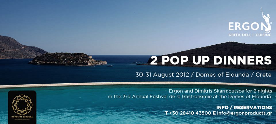 Μετά τη συμμετοχή σε μία από τις σημαντικότερες γαστρονομικές διοργανώσεις, το Taste of London, στις 30 και 31.08.2012, το ΕΡΓΟΝ και ο Δημήτρης Σκαρμούτσος θα βρεθούν στην Ελούντα, για 2 pop up dinners στα πλαίσια του 3rd Annual Festival Gastronomie, το festival που διοργανώνει το Domes of Elounda, όπου οι πρωτότυπες γεύσεις γνωστών σεφ της Ευρώπης, σε συνδυασμό με την πολυτέλεια και τις υψηλού επιπέδου υπηρεσίες συναντιούνται στο εστιατόριο Ανθός του ξενοδοχείου, με θέα το νησί της Σπιναλόγκας.