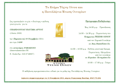 Κτήμα Τέχνη Οίνου και η Πανελλήνια Ένωση Οινοχόων σας προσκαλούν σε μία «ιδιαίτερη» κάθετη γευσιγνωσία για το CHARDONNAY ΗΔΥΣΜΑ ΔΡΥΟΣ (10ετία 2000), την Παρασκευή 18 Νοεμβρίου 2011 και ώρα 14:00, στο εστιατόριο PARADISO, (Αποστολοπούλου 58, Κ.Χαλάνδρι 210-6748667)