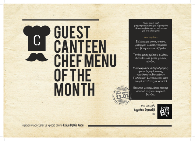 Την Τετάρτη 13 Ιανουαρίου θα έχουμε την ευκαιρία να απολαύσουμε επιλογές από το μενού του BarBq μαγειρεμένα από τον Άγγελο Φραντζή και την ομάδα του Canteen. Όλα τα πιάτα του μενού θα συνοδεύονται με επιλογές κρασιών από το Κτήμα Βιβλία Χώρα.