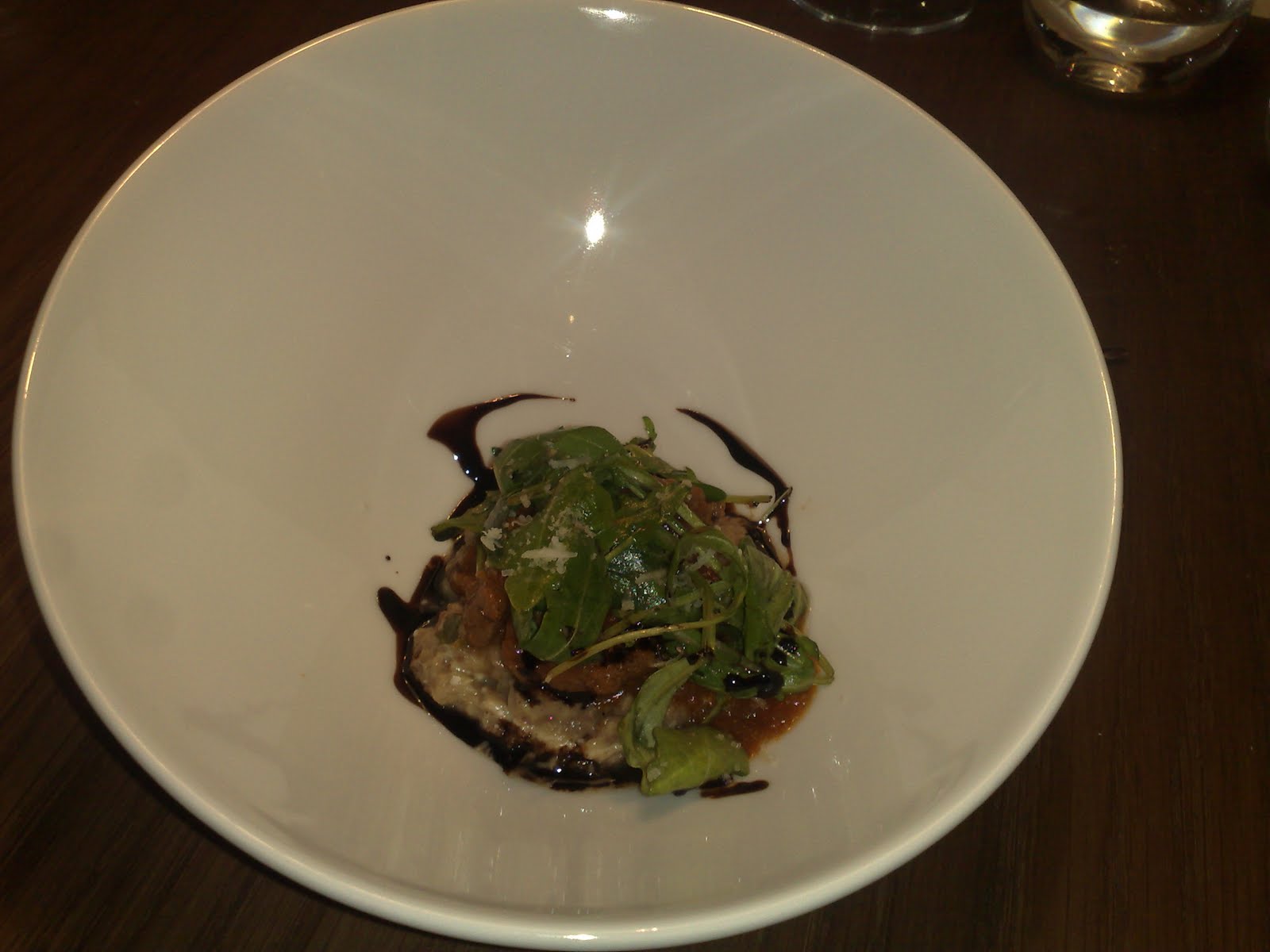 Κοκκινιστό μοσχαράκι με μοσχοκάρυδο, καρύδι, πουρέ μελιτζάνας, ρόκα και κρέμα βαλσάμικου *****