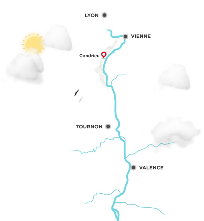 Οι αμπελώνες βρίσκονται σε ένα τμήμα του ποταμού Ροδανού (το όνομα Condrieu προέρχεται από μια γαλλική φράση που σημαίνει «γωνιά του ρυακιού»). Αυτός ο προσανατολισμός επιτρέπει στα αμπέλια να αποκτήσουν τη μέγιστη ζεστασιά και το φως του ήλιου στις πιο δροσερές ημέρες της άνοιξης και του φθινοπώρου, με αποτέλεσμα ώριμα, γευστικά κρασιά. Πολλές από αυτές τις πλαγιές είναι πάρα πολύ απότομες για να είναι προσβάσιμες σε μηχανήματα, επομένως συλλέγονται με το χέρι. Οι καλύτερες από αυτές τις πλαγιές αποτελούνται από μικτή κιμωλία, πυρόλιθο και μίκα, κάτι που μερικοί πιστεύουν ότι είναι υπεύθυνο για τα ορυκτά αρώματα που υπάρχουν στα καλύτερα κρασιά Condrieu. Ο συνδυασμός αυτών των εδαφών και το ξηρό, ζεστό κλίμα της περιοχής δημιουργούν ένα πολύτιμο και ξεχωριστό terroir.