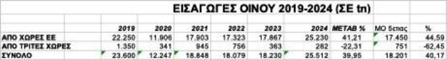 Οι χαμηλές τιμές οίνων ευρωπαϊκής προέλευσης , η απουσία ελέγχων, η ισχνή ελληνική οινοπαραγωγή του 2024 και η χαμηλή διαθεσιμότητα οίνων (συνυπολογιζόμενων και των αποθεμάτων 31/7/2023), είναι τα πιθανά αίτια που ώθησαν τους Έλληνες οινοπαραγωγούς σε μια άνευ προηγουμένου έκρηξη εισαγωγών οίνων σε ποσότητα το 2024 κατά 39,95%, σε σύγκριση με το 2023 (25.512 tn / 2024 – 18.230 tn/2023).