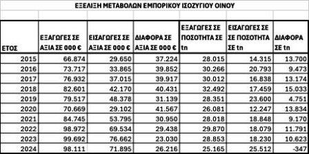 Τέλος πρέπει να επισημανθεί ότι η εικόνα του εμπορικού ισοζυγίου οίνου βαίνει μειούμενη ως προς το θετικό του πρόσημο σε αξία, ενώ για πρώτη φορά το 2024 εξελίχθηκε σε αρνητικό εμπορικό ισοζύγιο οίνου ως προς την ποσότητα, σύμφωνα με τον πίνακα που ακολουθεί: