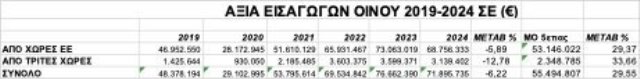 Σημαντική είναι και η αύξηση της μέσης τιμής εισαγόμενων οίνων από Τρίτες Χώρες κατά 12,27% το 2024 έναντι του 2023 (9,92€/kg-2023 – 11,13€/kg-2024).