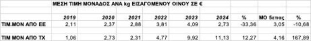 Συναρτόμενη με τα ανωτέρω μεγέθη η μέση τιμή αγοράς οίνων από χώρες της Ε.Ε. ανά kg, μειώθηκε το 2024 κατά 33,36% (2,73 €/kg-2024 – 4,09 €/kg-2023), γεγονός που οφείλεται όπως θα δούμε στην απόκτηση οίνων από την Βουλγαρία με μέση τιμή τα 0,42 €/ kg