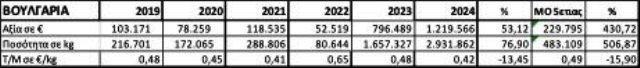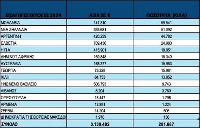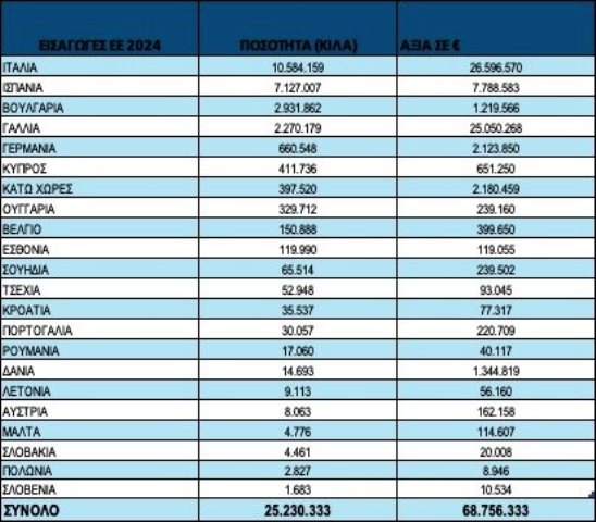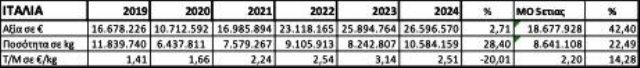 Αποτέλεσμα της εκρηκτικής ανόδου των εισαγωγών ήταν και το ότι για πρώτη φορά στα χρονικά οι εισαγωγές σε ποσότητα το 2024 (25.512.020 kg) υπερσκέλισαν τις αντίστοιχες εξαγωγές (25.164.991 kg).