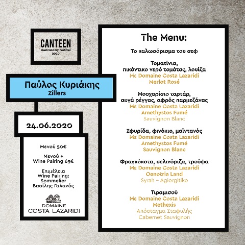 Την Τετάρτη 24 Ιουνίου, ο Παύλος Κυριάκης, ένας από τους αξιολογότερους και πολυβραβευμένους σεφ της ελληνικής γαστρονομικής σκηνής, παρουσιάζει ένα signature menu που θα συνδυαστεί με κρασιά του Domaine Costa Lazaridi.