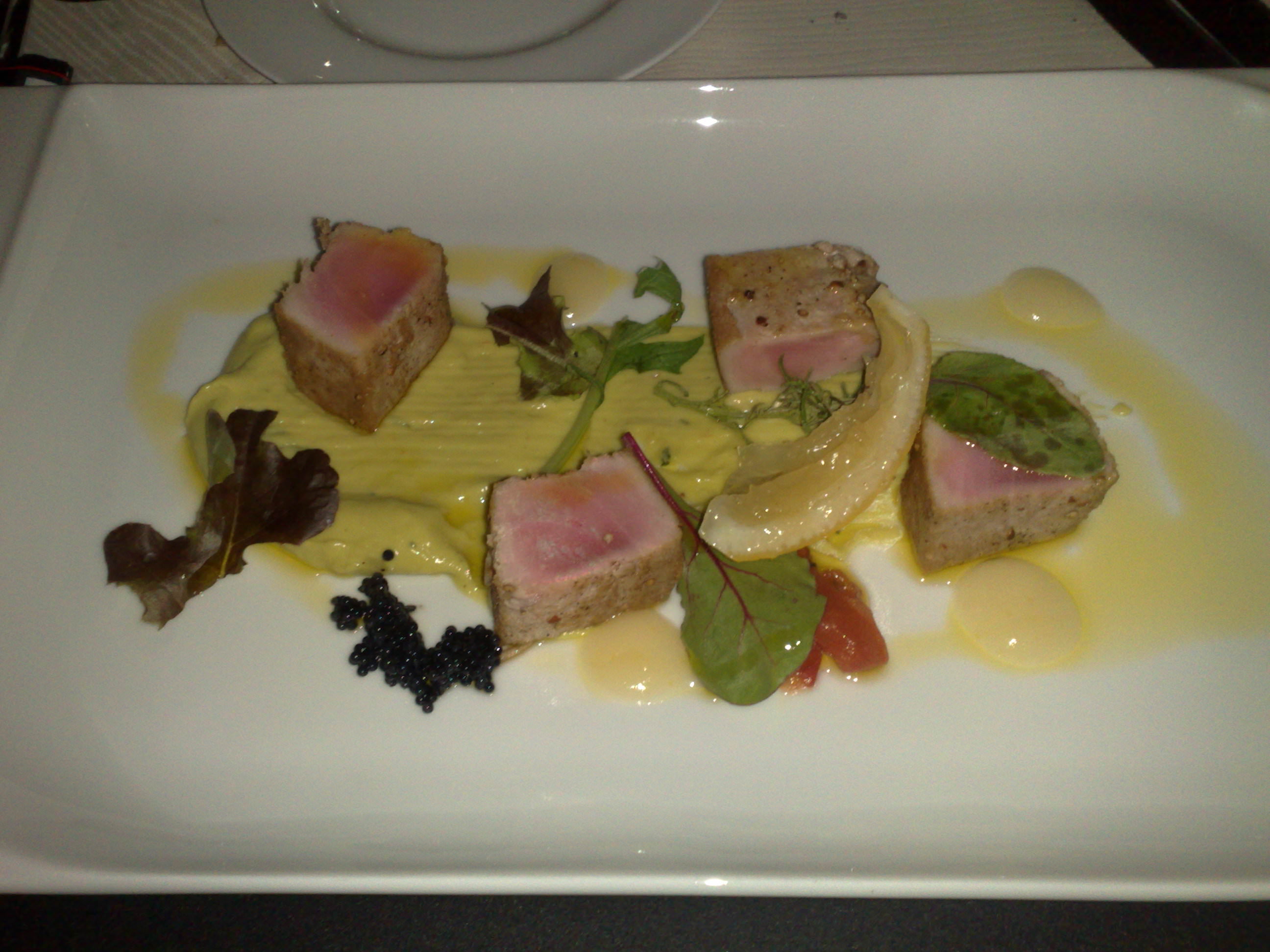 Τόνος “Tataki” με πουρέ αβοκάντο, τρυφερά φύλλα λαχανικών & κρέμα από κονφί λεμονιού