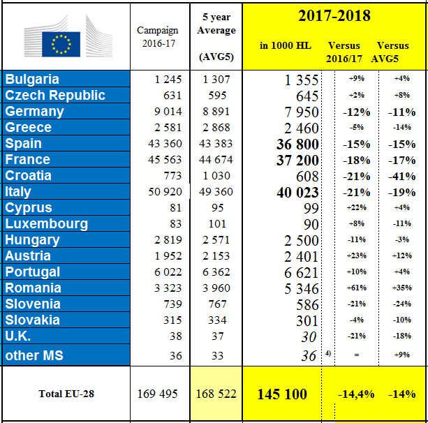Ο συνολικός όγκος σε ολόκληρη την ΕΕ για τη συγκομιδή 2017-2018 εκτιμάται ότι θα φτάσει τα 145 εκατομμύρια εκατόλιτρα, μείωση κατά -14% (22 εκατομμύρια εκατόλιτρα) στο επίπεδο που καταγράφηκε πέρυσι και 5,5 εκατομμύρια εκατόλιτρα λιγότερο από ό, τι το 2012-2013.