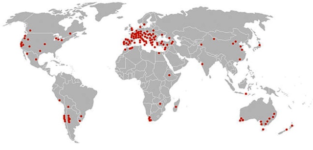 Τα κρασοστάφυλα μεγαλώνουν περίπου μεταξύ των 30 και 50 μοιρών γεωγραφικού πλάτους βόρεια και νότια του Ισημερινού. Τα νοτιότερα παγκοσμίως αμπέλια είναι στο Central Otago, περιοχή του Νότιου Νησιού της Νέας Ζηλανδίας κοντά στον 45ο παράλληλο και τα βορειότερα είναι στο Flen, της Σουηδίας, λίγο βορειότερα του 59ου βόρειου παράλληλου.