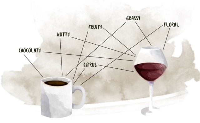 Για κάθε λέξη που χρησιμοποιούμε για να περιγράψουμε ένα συγκεκριμένο κρασί, υπάρχει ένας καφές που θα ταιριάζει με την ίδια περιγραφή. Για παράδειγμα, σοκολάτα, φρουτώδη, πικάντικα, ανθικά, ξηροί καρποί, χορτώδες, εσπεριδοειδή, γλυκά αρώματα και ούτω καθεξής.