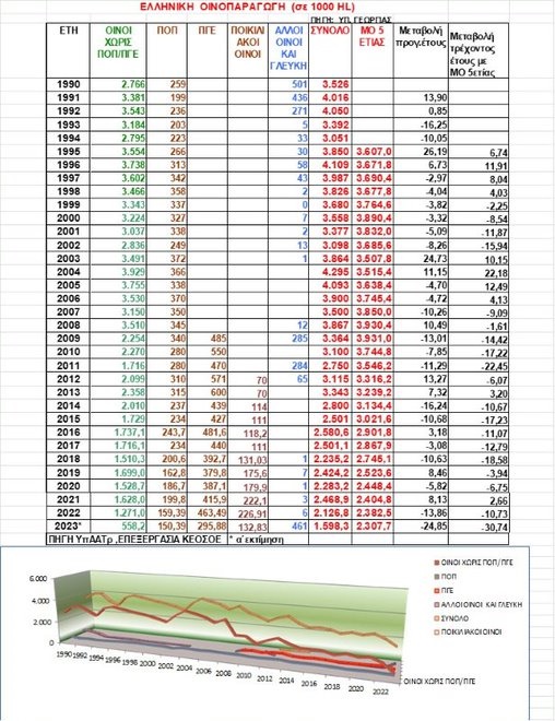 Ακολουθεί πίνακας με την εξέλιξη της ελληνικής οινοπαραγωγής από το 1990 μέχρι σήμερα, στον οποίο αποτυπώνεται η διαχρονική μείωση της παραγωγής οίνου στη χώρα μας, που όμως δεν οφείλεται στην κλιματική κρίση μόνο, αλλά κυρίως στην εγκατάλειψη της αμπελοκαλλιέργειας.