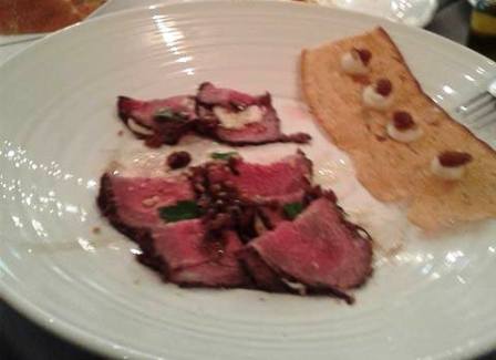 Το καρπάτσιο κρέατος τόσο λεπτό και δαντελένιο συνόδευε το κόκκινο κρασί μιας χώρας βιβλικής-Οβηλος ερυθρός, ένα μονοποικιλιακό Cabernet Sauvignon από το icon κτήμα της Καβάλας…