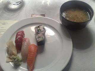 Ποικιλία από sushi συνοδευόμενα από σούπα miso