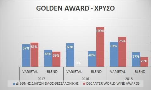 Στην περίπτωση του Χρυσού/Gold Award, τα στοιχεία δείχνουν μια ασυνέπεια ως προς την επαναληψιμότητα των προτιμήσεων από τους κριτές, με τα κρασιά που πήραν μέρος στους διαγωνισμούς το 2016 να παρουσιάζουν μια αντιφατική εικόνα. Αναλυτικότερα, τα βραβεία του Διαγωνισμού Θεσσαλονίκης δείχνουν μια σταθερή προτίμηση των κριτών προς τους μονοποικιλιακούς οίνους, σε σταθερή όμως αναλογία με τους πολυποικιλιακούς. Παρόμοιο συμπέρασμα θα μπορούσε να εξαχθεί και για τους κριτές του DWWA, με εξαίρεση το 2016, με πιο έντονη την προτίμηση τους στους μονοποικιλιακούς οίνους. Η περίπτωση του 2016 είναι ξεχωριστή και απαιτεί πιο βαθιά έρευνα που να περιλαμβάνει τις ετικέτες και τους παραγωγούς που έλαβαν μέρος στο διαγωνισμό. Το γεγονός ότι, οι μονοποικιλιακοί οίνοι που εστάλησαν στην Αγγλία δεν κατάφεραν να κερδίσουν κάποια βαθμολογία που να τους χαρίσει το χρυσό βραβείο ενώ στην Θεσσαλονίκη επικράτησαν, είναι προβληματικό ως προς τα κριτήρια που θέτουν οι δύο διαγωνισμοί με τον έναν από αυτούς να υστερεί. Ποιος όμως;