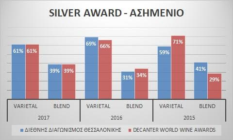 Η τελευταία κατηγορία είναι αυτή του Ασημένιου/Silver Award τα αποτελέσματα της οποίας οριακά συμπίπτουν, καθώς σε όλες τις εξεταζόμενες χρονιές και θα μπορούσε να γίνει λόγος ακόμα και για ταύτιση αποτελεσμάτων και προτιμήσεων. Οι μονοποικιλιακοί οίνοι δείχνουν να προηγούνται σταθερά και στους δύο διαγωνισμούς, χωρίς περιθώρια αμφισβήτησης.