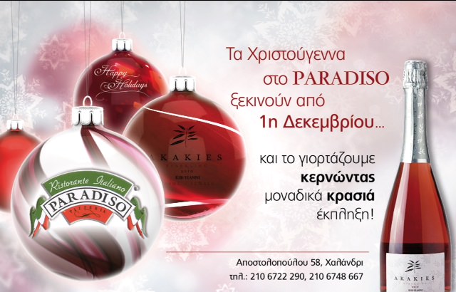 Σε αυτές τις γιορτές προσκαλέστε τα αγαπημένα σας πρόσωπα σε ένα όμορφο γευστικό ταξίδι... Δεθείτε μαζί τους ακόμα περισσότερο με οινικές απολαύσεις που θα μείνουν ανεξίτηλες στο χρόνο. Το Paradiso γιορτάζει μαζί σας και κερνάει όλο τον Δεκέμβριο εσάς και την όμορφη παρέα σας, μοναδικές, γιορτινές, αφρώδεις ροζέ Ακακίες, από το κτήμα Κυρ Γιάννη....