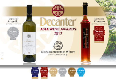 Δύο διακρίσεις για κρασιά του οινοποιείου Κουτσογιαννόπουλου από την Σαντορίνη, στο Decanter Αsia Wine Awards. Πιό συγκεκριμένα στον διαγωνισμό Decanter Αsia Wine Awards στο Hong Kong βραβεύτηκαν : το Σαντορίνη Ασύρτικο 2011 με ασημένιο μετάλλιο https://www.decanterchina.com/en/dawa/dawa-2012-results.html?award=991 & το Vinsanto 2009 με Regional TROPHY https://www.decanterchina.com/en/dawa/dawa-2012-results.html?award=989 Ήταν οι μεγαλύτερες διακρίσεις από όλα τα Ελληνικά κρασιά που συμμετείχαν