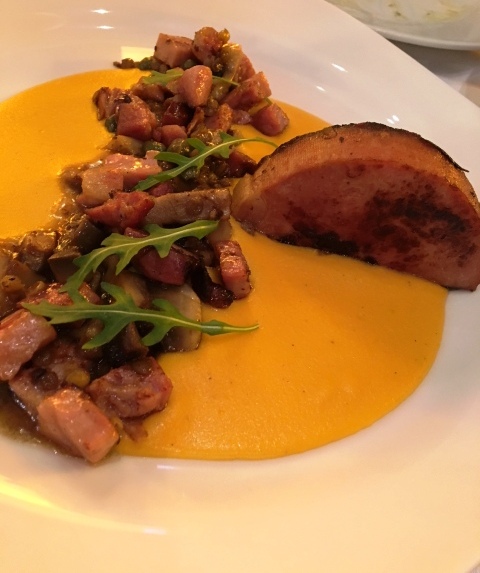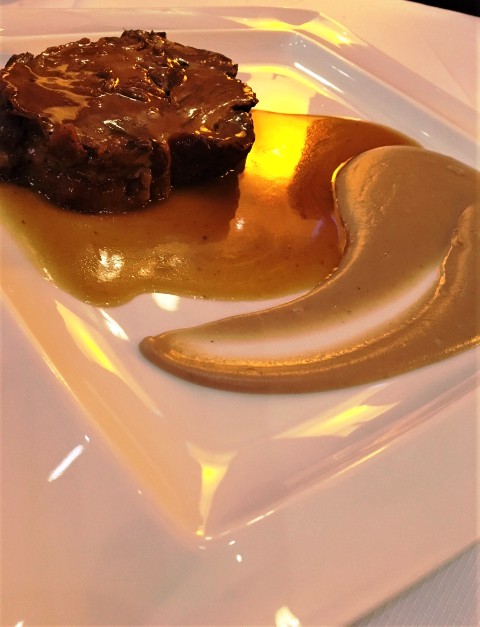 ζαρια καπνιστού χοιρινού με μπέικον κάπαρη μανιτάρια πάνω σε πουρέ καρότου