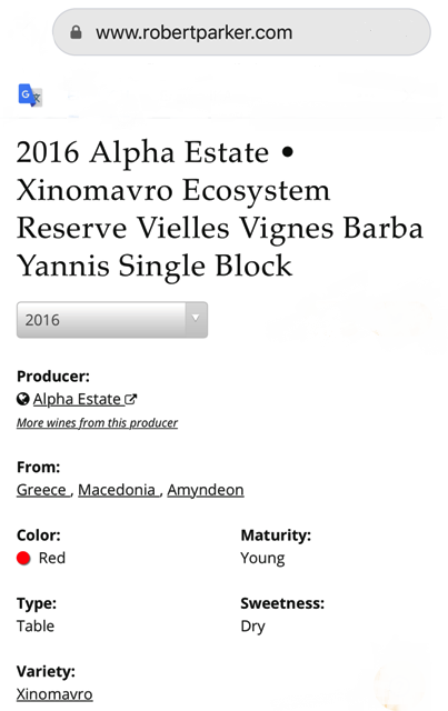94+ στο Κτήμα Άλφα Ξινόμαυρο Old Vines Reserve Ecosystem 2016 από το robertparker.com