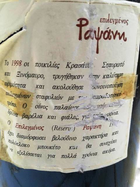Μια τέλεια απάντηση στην ερώτηση του γιατί πολλοί άνθρωποι πληρώνουν αρκετά χρήματα για να δοκιμάσουνε μεγάλα, ώριμα κρασιά και γιατί πολλές φορές αξίζει να περιμένεις πολλά χρόνια για να δοκιμάσεις κάτι μοναδικό. Η Ραψάνη Tsantali 1998 θα μπορούσε να είναι το κρασί για να το εξηγήσει. Ένα τέλειο παράδειγμα ενός πανέμορφου, ώριμου ελληνικού ερυθρού κρασιού -σχεδόν- 20 ετών που θα μπορούσε να κάνει πολλά συνομίληκα Pauillac να κοκκινήσουν.