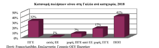 Τα στοιχεία του 2018 επιβεβαιώνουν μια πτώση του όγκου των αγορών μη αφρώδους οίνου για οικιακή κατανάλωση κατά 5,2% και μία πτώση της συνολικής αξίας κατά 1,9% σε σχέση με το 2017. Σύμφωνα με όσα δηλώθηκαν από τα νοικοκυριά, το 50% των αγορών μη αφρώδους οίνου για το 2018 αφορούσε ερυθρό οίνο, ενώ τα ποσοστά για λευκό και ροζέ οίνο ήταν 32% και 18% αντίστοιχα. Οι οίνοι με ετικέτα ΠΟΠ καταλαμβάνουν μεγάλο ποσοστό στο σύνολο των αγορών οίνου (41%) και ιδιαίτερα στον ερυθρό και τον λευκό οίνο με ποσοστά 49% και 46% αντίστοιχα. Επίσης, οι ΠΓΕ οίνοι αντιπροσωπεύουν το 32% των αγορών και εντοπίζονται κυρίως στο ροζέ οίνο (46%). Οι οίνοι με ετικέτα ΠΓΕ (17%) βρίσκονται στη δεύτερη θέση, ενώ οι οίνοι τρίτων χωρών δεν αποτελούν παρά το 1% των συνολικών αγορών οίνου.