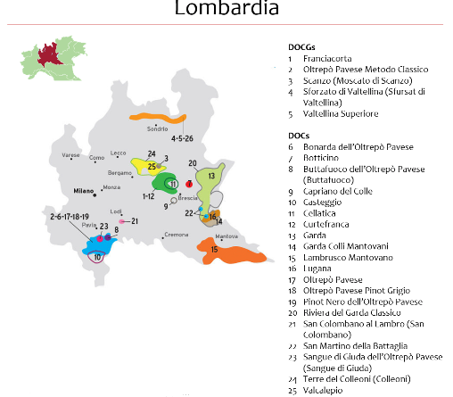 Η περιοχή της Λομβαρδίας αποτελείται από 13 οινοπαραγωγικές περιοχές- από βορρά-νότο περιλαμβάνουν: