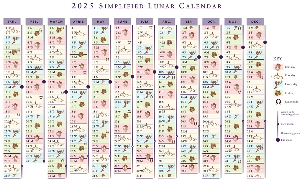 Αυτό το σεληνιακό ημερολόγιο, που ενσωματώνει τις φάσεις της σελήνης και τη διέλευσή της από τους αστερισμούς, καθοδηγεί κάθε βήμα στη βιοδυναμική γεωργία.