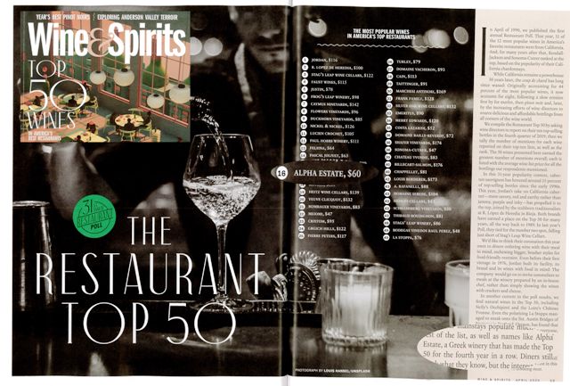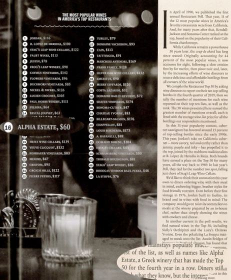 Το έγκριτο περιοδικό Οίνου και Αποσταγμάτων, Wine & Spirits, τα τελευταία 31 χρόνια, καταρτίζει μια λίστα με τα 50 δημοφιλέστερα οινοποιεία, σύμφωνα με την ζήτηση των καταναλωτών, στα Αμερικάνικα εστιατόρια.