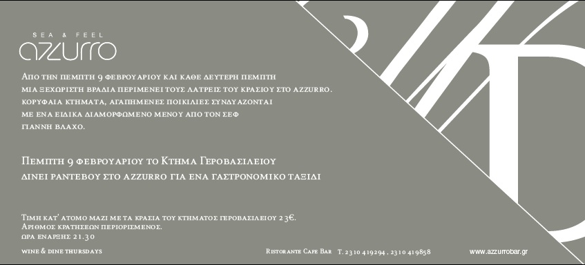 Από την Πέμπτη 9 Φεβρουαρίου και κάθε Δεύτερη Πέμπτη μια ξεχωριστή βραδιά περιμένει τους λάτρεις του καλού φαγητού και κρασιού στο Azzuro. Κορυφαία κτήματα από τον Ελληνικό αμπελώνα συνδυάζονται με ένα ειδικά διαμορφωμένο μενού από τον σεφ Γιάννη Βλάχο.