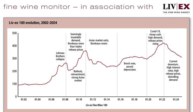 Από πέρυσι αυτή την περίοδο, ο δείκτης Liv-ex Fine Wine 100 έχει υποχωρήσει κατά 4,9%, σημειώνοντας πτώση 26,6% από την κορύφωσή του τον Σεπτέμβριο του 2022. Έχοντας πλέον πέσει κάτω από την κορύφωσή του το 2018, το χαμηλό του 2020 είναι η επόμενη διαθέσιμη στήριξη – μια πλήρης αναδρομή στην προηγούμενη ανοδική κίνηση του δείκτη.