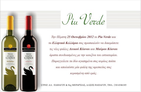 Την Πέμπτη 25 Οκτωβρίου 2012 η Ελληνικά Κελλάρια Οίνων Α.Ε. και το εστιατόριο Piu Verde (Στρατηγού Παπάγου & 8ης Μεραρχίας, τηλ.: 210-6546185) σας καλούν να δοκιμάσετε μια απολαυστική προσφορά.