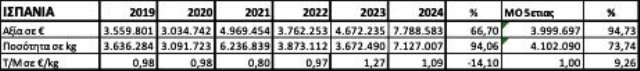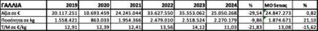 Αποτέλεσμα της εκρηκτικής ανόδου των εισαγωγών ήταν και το ότι για πρώτη φορά στα χρονικά οι εισαγωγές σε ποσότητα το 2024 (25.512.020 kg) υπερσκέλισαν τις αντίστοιχες εξαγωγές (25.164.991 kg).