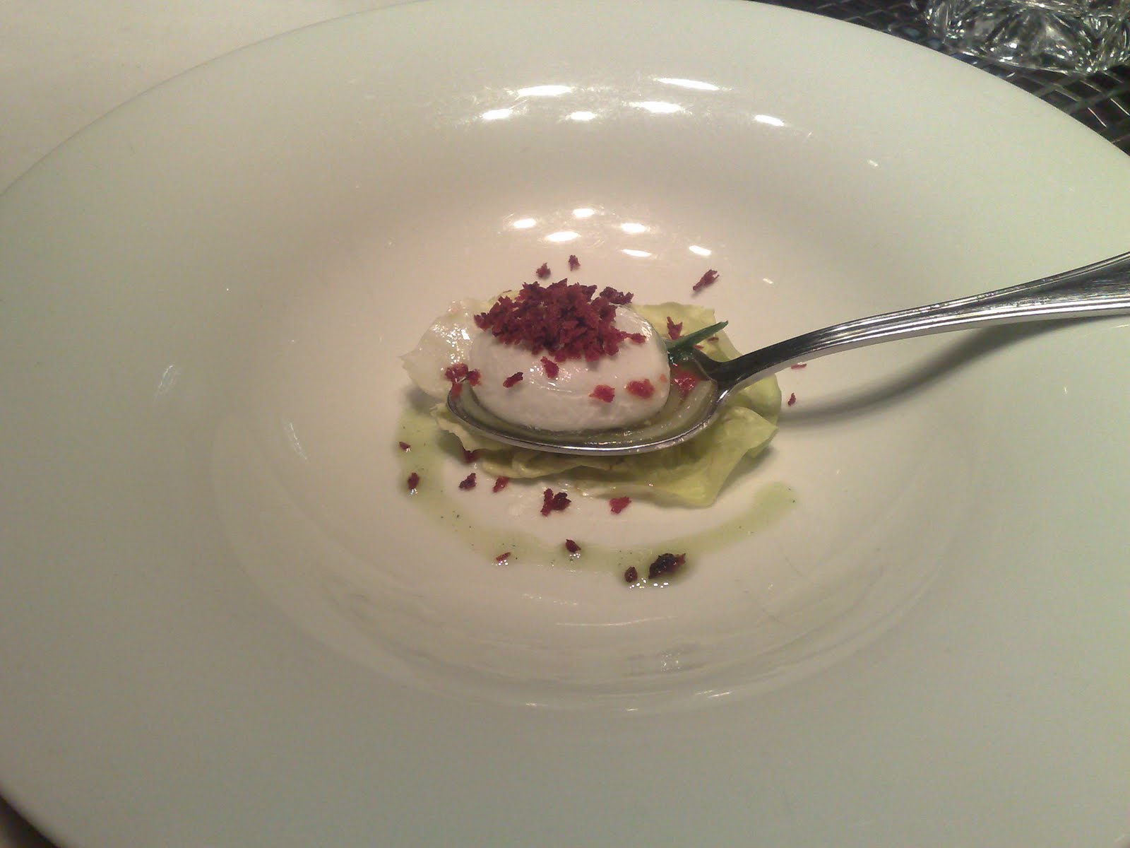 Greek salad D.N.T.Julian of fresh cucumber, sferification of feta cheese and tomato crumble
